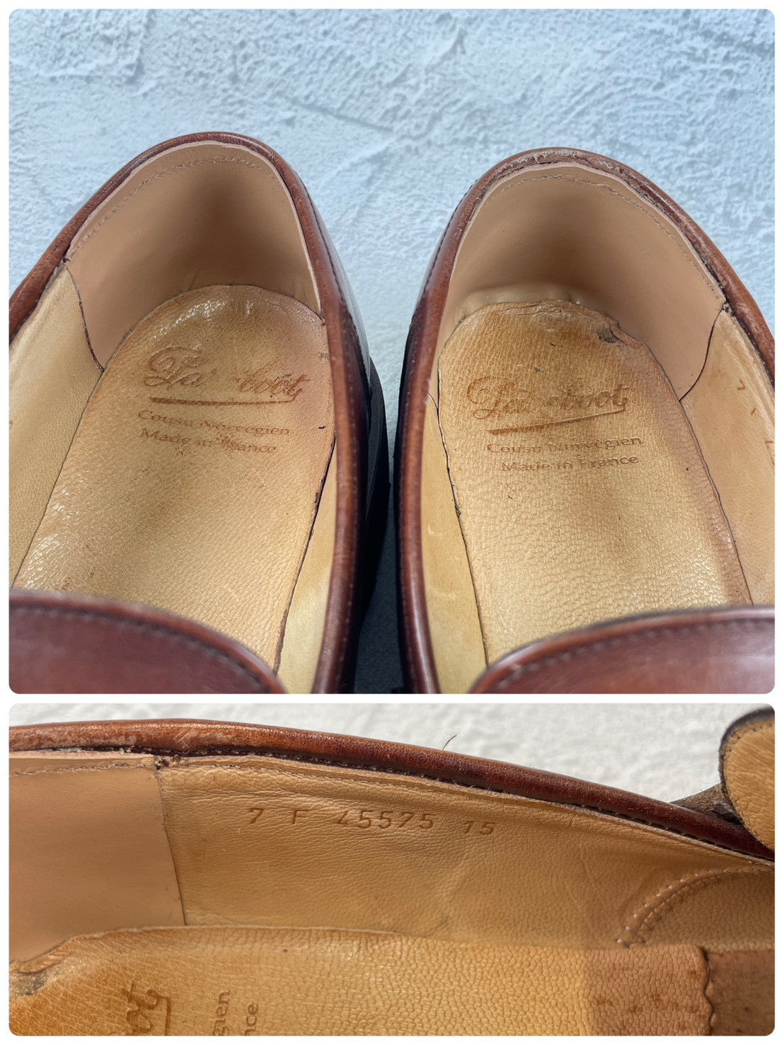 Upper: Wrinkles, fading, and discoloration. Lining: Repaired heel with leather. Sole: Slight wear overall. Overall: These loafers show some signs of wear, but have a sophisticated, refined feel. They'll develop a unique character with every wear. (Please see photos for details.)