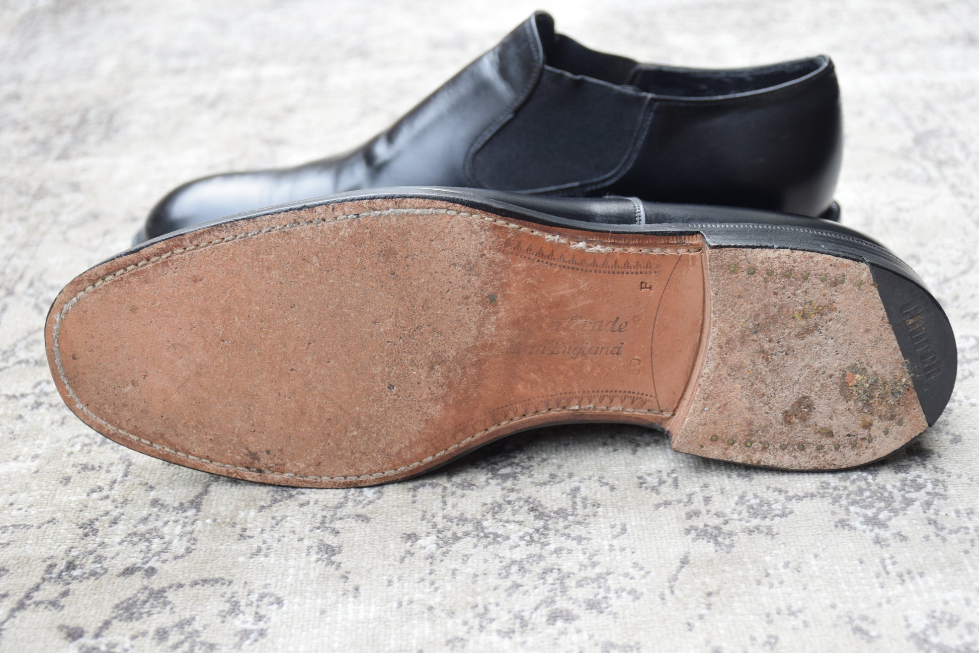 Introducing a classic four-city-stamped side-gore shoe from Church's, a long-established British shoemaker. These low-cut, lightweight shoes pair well with slacks, black denim, and military pants. The clean, semi-square last and premium black calfskin create a chic look. The side-gore design makes them easy to put on and take off, making them a practical and appealing choice for adults.