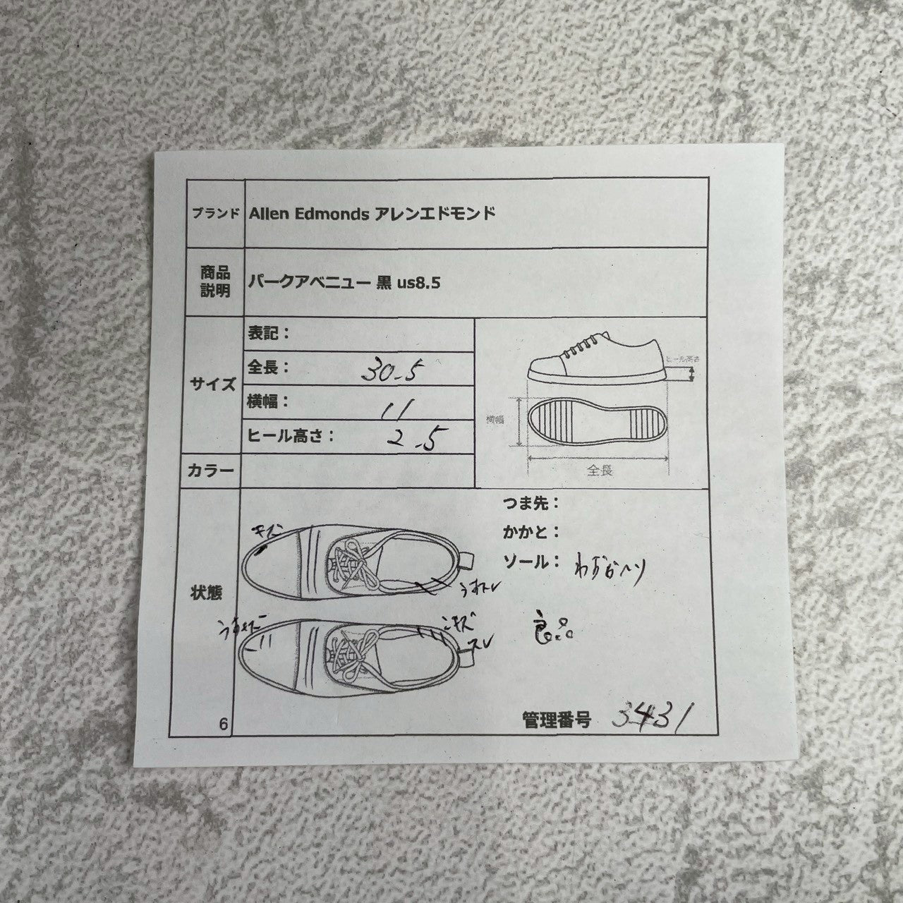 Brand: Allen Edmonds; Model: Park Avenue; Size: US 8.5 / 8 1/2 / 3E / 26.5cm (equivalent to US size 26.5cm); Outsole: Total length 30.5cm / Width 11cm / Heel height 2.5cm