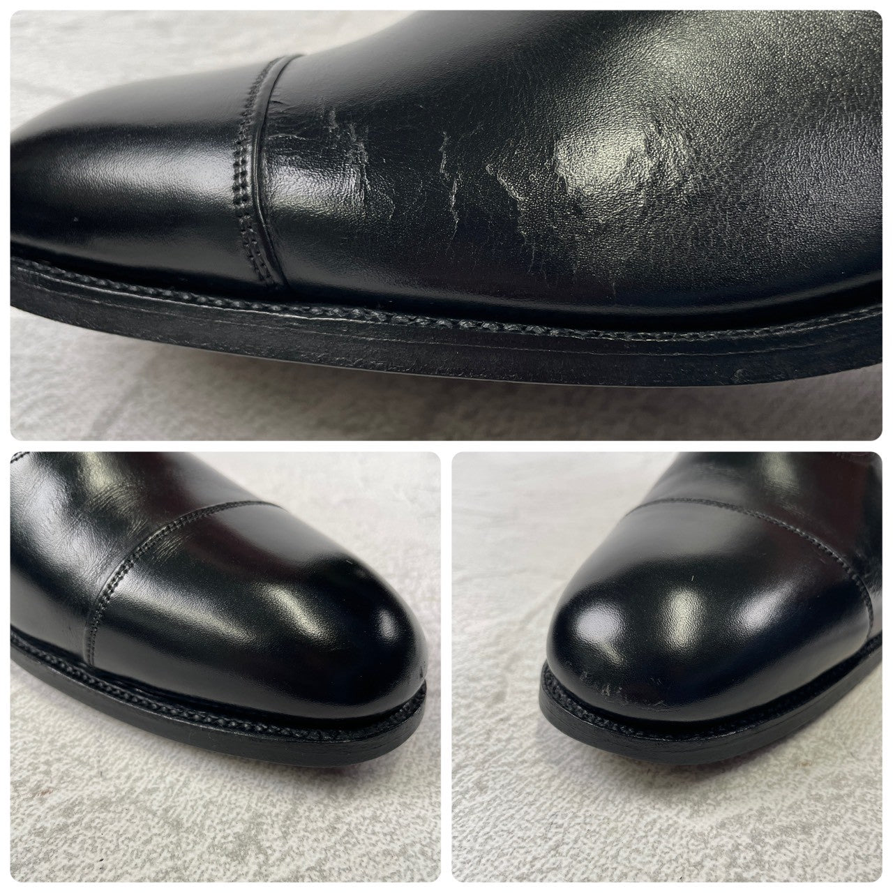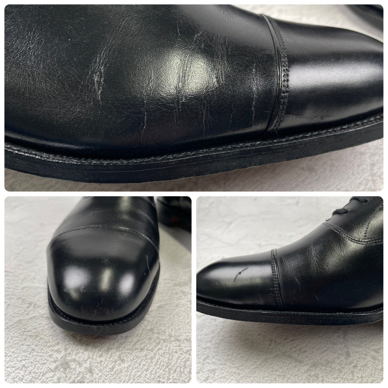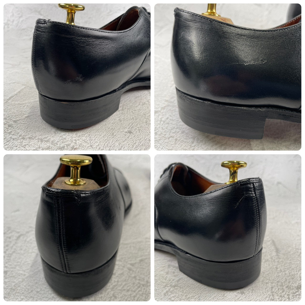 ・アッパー(上部)→全体的に小傷や履きジワが見られます。一部、履きジワに伴うクラック(ひび割れ)や、かかと部分に小さな裂け