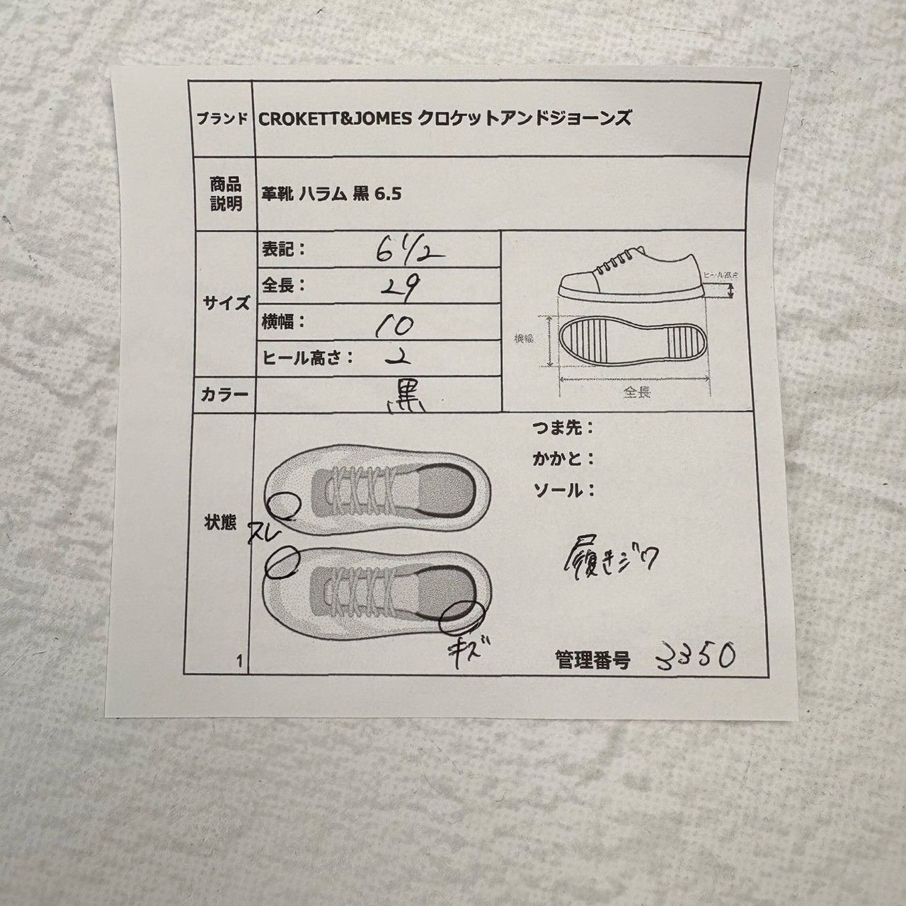 『英国靴の王道、クロケット&ジョーンズの定番ストレートチップ』 【ブランド】Crockett & Jones クロケットアンドジョーンズ 【モデル】Hallam ハラム 【サイズ】UK6.5 / 25.0cm 【アウトソール】全長29cm / 横幅10cm / ヒール高さ2cm 【カラー】黒 / ブラック 【ソール】レザーソール(リフト交換済み) 【ラスト】337 【仕様】ストレートチップ、内羽根式、スクエア、5アイレット 【付属品】なし 【コンディション】 ・アッパー(上部)→履きジワ、つま先に傷あり、かかとに傷あり ・ライニング(内側)→少しすれ ・ソール(靴底)→リフト交換済み ・靴の総評→使用感はありますが、 まだまだご愛用いただけるコンディションです ※写真でもご確認ください。 【コメント】 クロケット&ジョーンズの定番人気モデル「ハラム」。 内羽根ストレートチップの端正なデザインは、フォーマルからビジネスまで幅広く対応できる万能な一足です。 英国靴らしいクラシックな雰囲気に加え、スマートなシルエットが洗練された印象を与えてくれます。リフト交換済みで、これから安心してお使いいただけます。 【スタイル提案】 ビジネス・きれいめ W3350.124