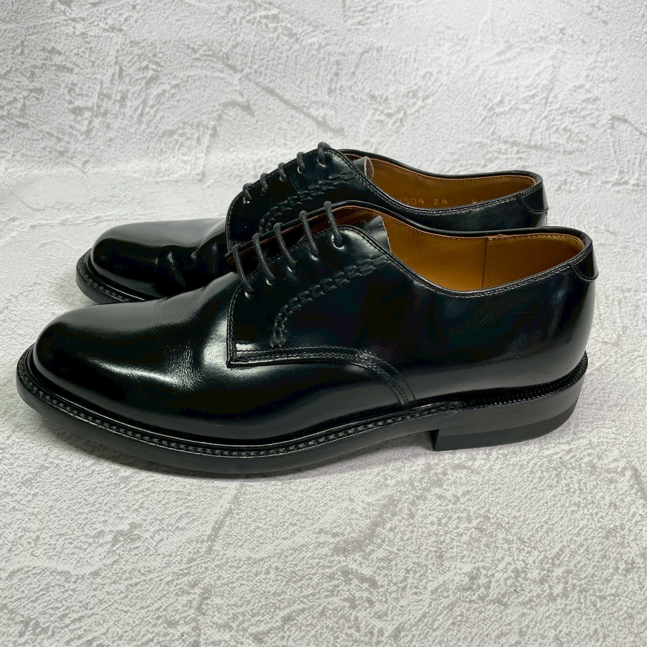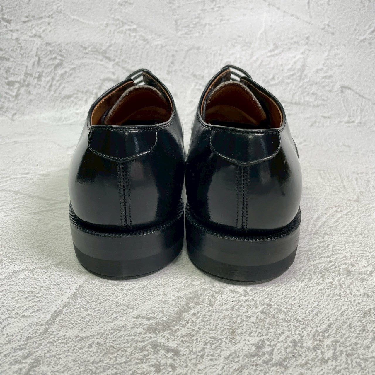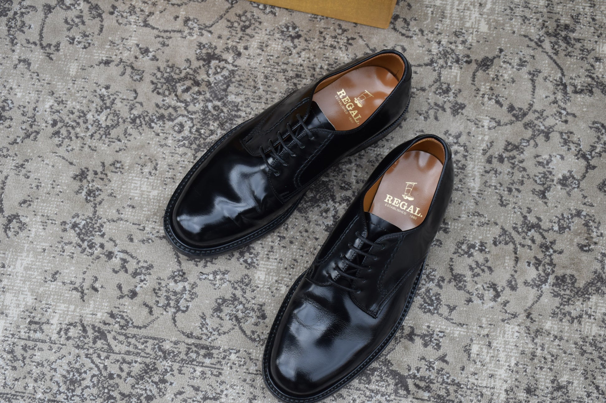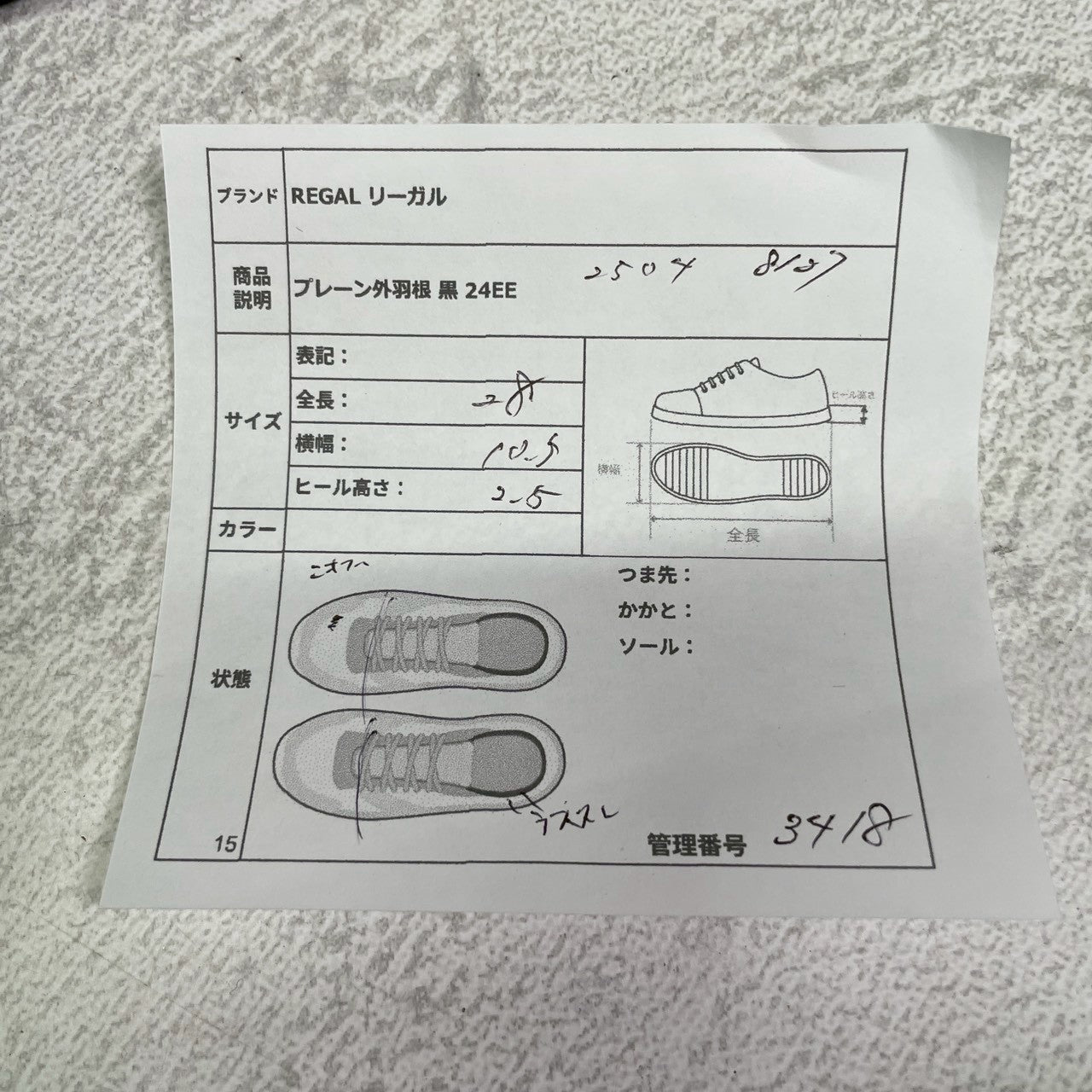 『仕事靴に“ちょうどいい”一足。気負わず履けるリーガル』 ~~~~~商品詳細~~~~~ 【ブランド】REGAL / リーガル 【モデル】プレーン 外羽根 【サイズ】24cm EE 【アウトソール】全長28cm / 横幅10.5cm / ヒール高さ2.5cm 【カラー】黒 / ブラック / BLACK 【ソール】ラバーソール 【仕様】外羽根式 / プレーントゥ / ガラスレザー 【付属品】箱 ~~~~~商品説明~~~~~ 【コメント】 ビジネスシューズの定番ブランド「リーガル」より、シンプルで使い勝手の良いプレーントゥ。外羽根式で足入れしやすく、ケアが簡単なガラスレザー仕様のため、日常使いにも最適。既に1〜2足お持ちの方の“ローテーション用”にもおすすめです。 【コンディション】 ・アッパー(上部)→右足つま先に小傷、履きジワ、左かかとに軽い擦れあり ・ライニング(内側)→大きなダメージなし ・ソール(靴底)→目立つ摩耗なし、美品状態 ・靴の総評→わずかな使用感はありますが、全体的に綺麗な印象で、まだまだ長くご使用いただけます。ビジネススタイルを支える実用的な一足です。 ※写真でもご確認ください。 _______________