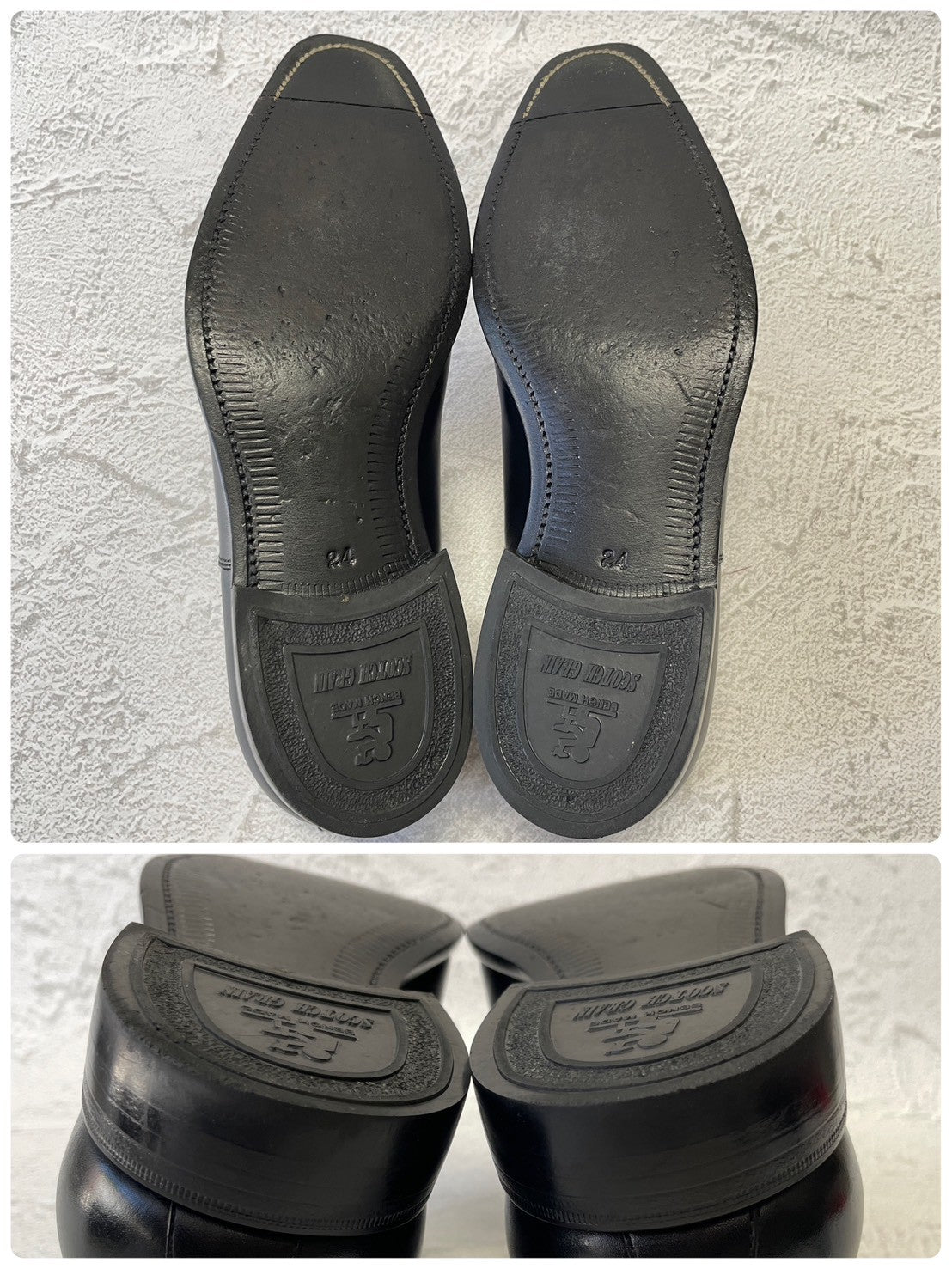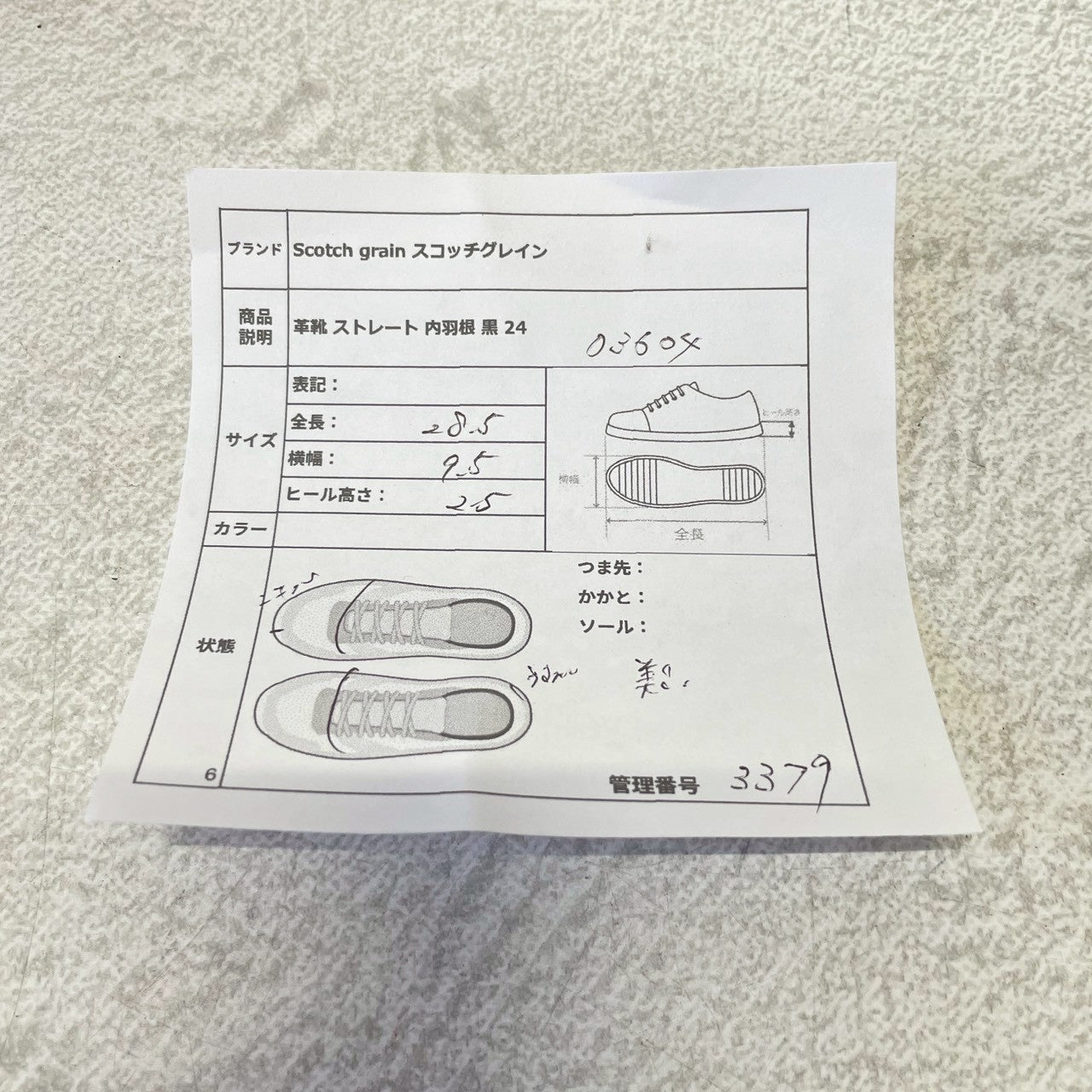 『日本の革靴技術が光る、美しいストレートチップの逸品』 ~~~~~商品詳細~~~~~ 【ブランド】SCOTCH GRAIN スコッチグレイン 【モデル】03604 【サイズ】24.0cm 【アウトソール】全長28.5cm / 横幅9.5cm / ヒール高さ2.5cm 【カラー】黒 / ブラック 【ソール】レザーソール 【仕様】内羽根 / ストレートチップ / オックスフォード 【付属品】シューキーパー ~~~~~商品説明~~~~~ 【コメント】 国産革靴ブランドとして高い評価を得ているSCOTCH GRAIN(スコッチグレイン)のストレートチップモデル「03604」です。上質な国産レザーを使用し、丁寧な縫製とグッドイヤーウェルト製法によって堅牢さと快適な履き心地を両立。ビジネスシーンに最適な、清潔感あるシンプルなデザインが魅力の一足です。 【コンディション】 ・アッパー(上部)→ 履きジワあり、右つま先に小傷、左かかとに軽い擦れ ・ライニング(内側)→ 良好 ・ソール(靴底)→ 軽い使用感あり ・靴の総評 → 使用感はあるものの、全体的にきれいな状態で、革の艶もしっかり残っています。日本製らしい丁寧なつくりを体感いただける美品です。 ※状態は写真でもご確認ください。 _______________ 【当店について】 ご購入前にショップ情報をご確認ください。 W3379.65