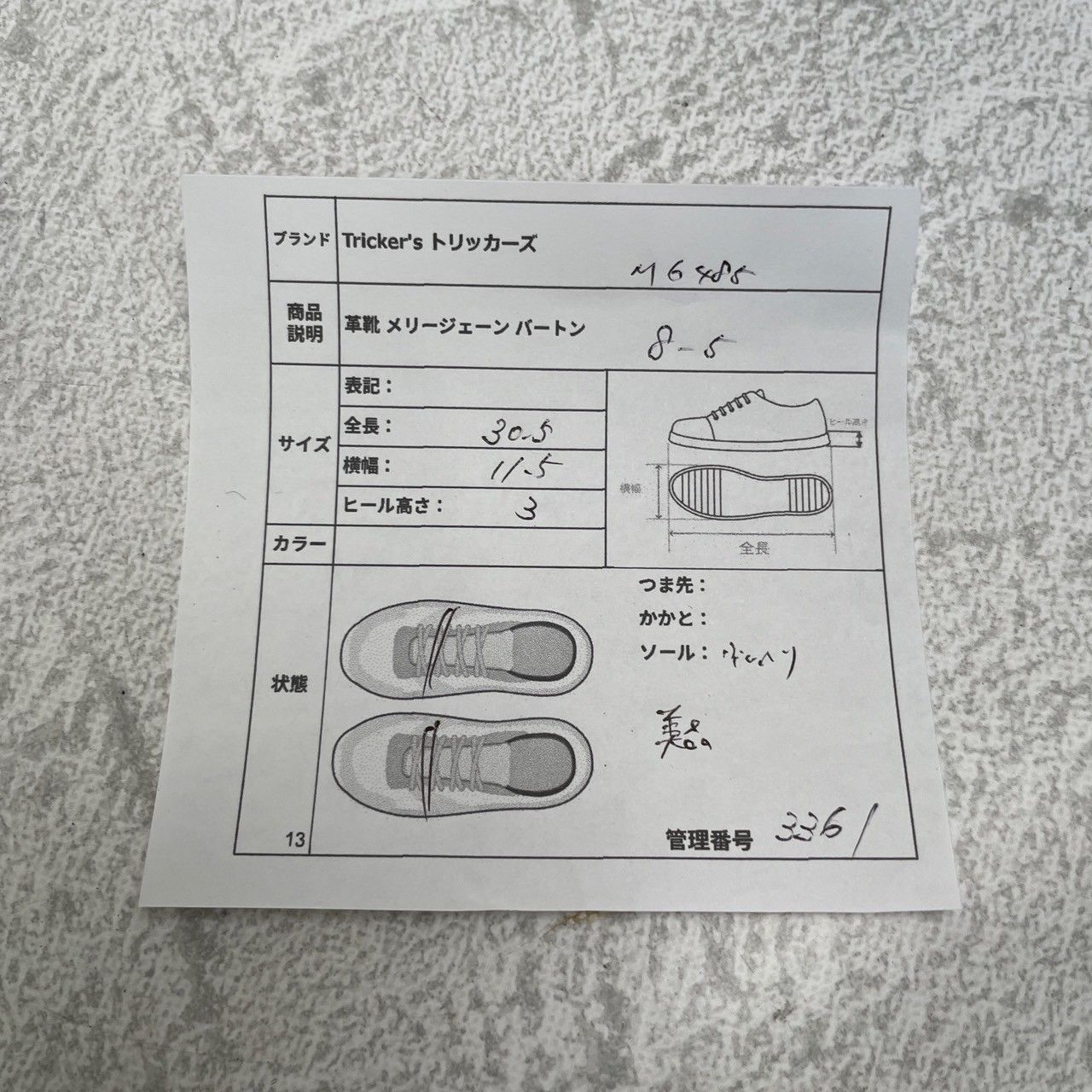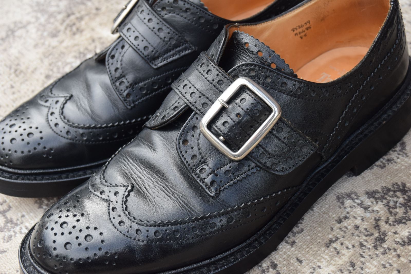 ・靴の総評:ストラップ付きウイング仕様の個性的なトリッカーズ。状態良好で、存在感のある一足です。