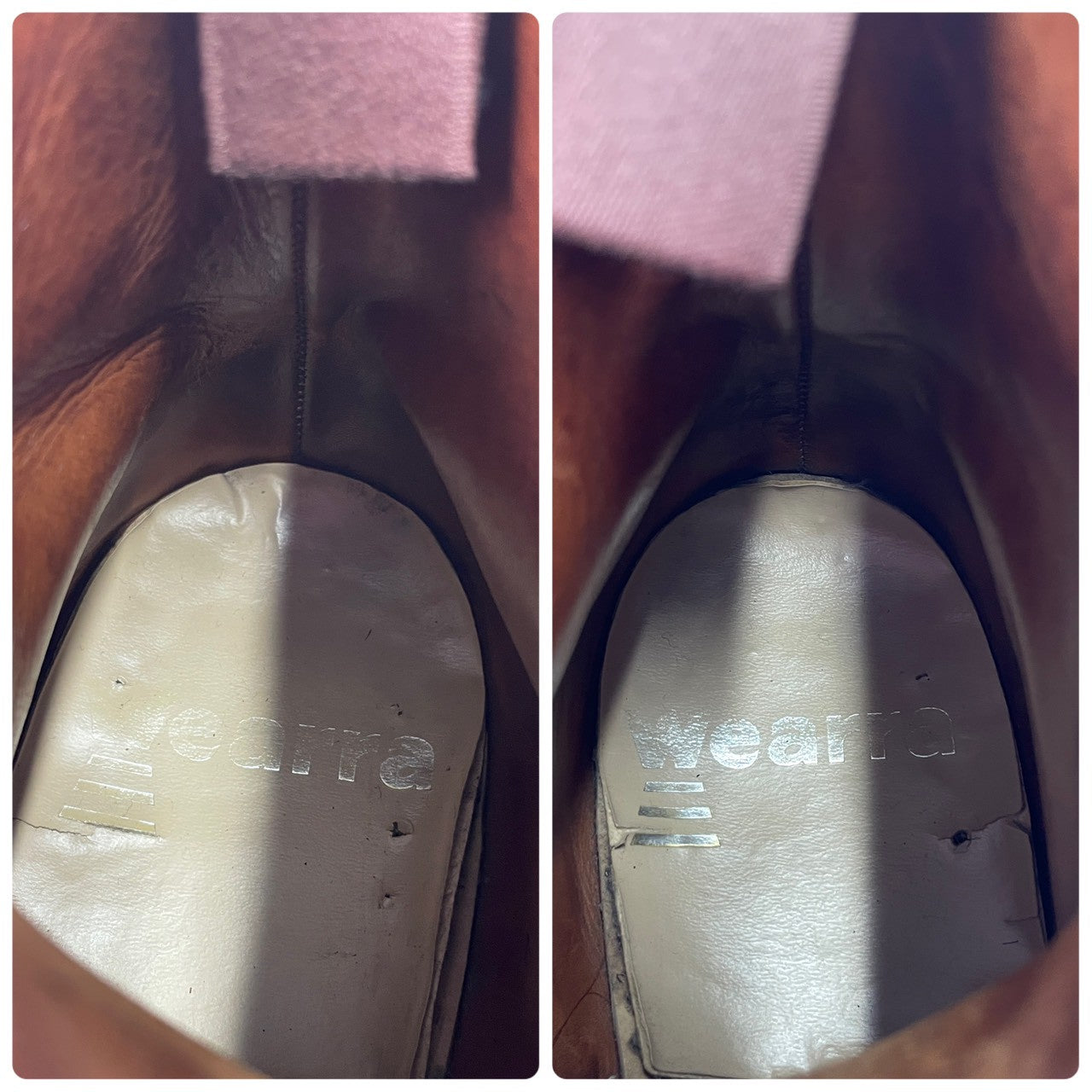 1960年代から70年代頃のものと推測される、英国の旧き良き名門ブランド「WEARRA(ウェアラ)」のヴィンテージブーツです。現存しないブランドゆえに市場に出回る数も少なく、当時の職人気質が宿る丁寧な作りは、現行の既成靴では味わえない独特のオーラを放っています。ポリッシュドレザーのような美しい光沢感と、ストレートチップがもたらす端正な表情が魅力。デニムでカジュアルに落とし込むのはもちろん、ドレッシーな装いの外しとしても、圧倒的な存在感を発揮する希少なアーカイブピースです。